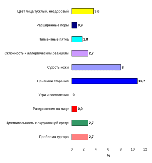 Мы можем наблюдать тенденцию изменения проблем кожи в зависимости от возраста человека. В категории 40-49 лет на первое место по показателям занимает проблема - старения кожи, а так же сухость кожи. Самые маленькие показатели у проблем связанных с угрями и воспалениями на лице, а так же проблем с появление тургора.