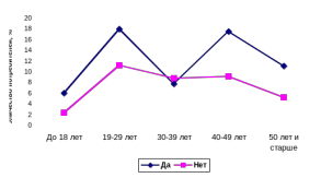 Из рисунка 1.12 видно, что лиц, считающих, что у них есть проблемы с кожей, больше. Также хорошо заметно, что в основном проблемы с кожей у молодежи (19—29 лет) — 17,8% и у лиц 40—49 лет — 17,3%. Средняя возрастная категория (30—39 лет) разделилась, часть лиц этой группы имеют проблемы с кожей (7,6%) и у чуть большей части нет проблем с кожей (8,6%).