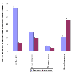 Рассмотрим данные, полученные при изучении отношения людей к своей коже. Данные о частоте ухаживания за кожей лица и рук представлены на рисунке 1.11 (а, б) Из диаграммы видно, что 35,2 % женщин ухаживает за кожей лица и 31,9% — за кожей рук каждый день. Мужчины же в большинстве предпочитают ухаживать за кожей лиц; (13,5%) и рук (22,7%) по необходимости. Также значительное число мужчин ухаживает за кожей лица (12,9%) каждый день. Полученные данные можно применить к оценке величины спроса на соответствующие наименования косметических средств, т.е. крема для лица и крема для рук.