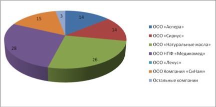 Более 50 % представленной продукции приходиться на 2 компании – ООО НПФ «Медикомед» и ООО «Натуральные масла» (рис. 4)