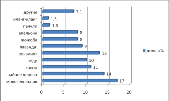 Наибольшим спросом в данной аптеке пользуются масла можжевельника и чайного дерева. На их продажи приходиться 17 и 14 % всего объема эфирных масел в ООО «Альтафарм» (рис.5).