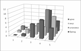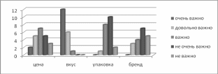 На диаграмме видно, что при выборе жевательной резинки респондент, прежде всего, обращает на ее вкусовые особенности, затем на то, как оформлена упаковка и менее всего потребителя интересует бренд.