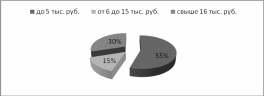 На рисунке видно что 55% респондентов имеют доход до 5 тысяч рублей, 30% - свыше 16 тысяч рублей и 15 % опрошенных – от 6 до 15 тысяч рублей.