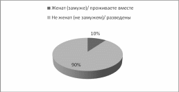 Из диаграммы видно что в основном были опрошены респонденты не женатые (не замужние) – (90%),и менее всего женатые (замужние) – (10%) .