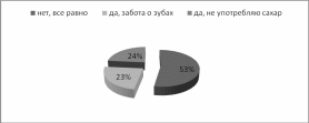 На диаграмме видно что большинство респондентов не обращают внимание на наличие сахара в жевательной резинке (53%) и с отличим в один процент для потребителя важен состав жевательной резинки, так как 23% заботятся о здоровье зубов и 24% не употребляют сахар в пищу в силу каких-либо причин.