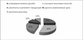 В результате опроса определились основные направления улучшения продукции. Респонденты в первую очередь предложили улучшить вкусовые качества продукции, усовершенствовать дизайн, повысить ассортимент, сделать приемлемую цену и увеличить рекламу.