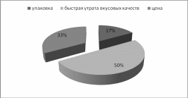 В ходе опроса 50% респондентов ответили, что их не устраивают быстрая, 33% утрата вкусовых качеств, 33% ответили, что качество продукции не соответствует цене, 17% не устраивает внешний вид продукции.