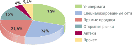 Продажи косметики и парфюмерии on-line – наиболее динамично развивающийся канал сбыта. Рост продаж через интернет в 2005 году, по данным Национальной ассоциации участников электронной торговли, вырос на 1000% (с 0,8 до 8 млн долларов). В то же время в физическом выражении объем торговли косметики через интернет пока весьма незначителен – 0,8% всех продаваемых on-line товаров.