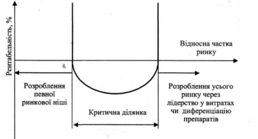 Загальна стратегічна модель Портера ґрунтується на положенні, що шанс досягнути необхідного рівня рентабельності мають як великі фармацевтичні підприємства із значною часткою ринку, так і невеликі спеціалізовані фірми. При цьому небезпечною є середня позиція, і тому підприємствам, які не мають засобів чи зусиль для досягнення лідерства на ринку, необхідно сконцентрувати свою роботу на певному сегменті і нарощувати там переваги стосовно конкурентів. Зв'язок між часткою ринку і рентабельністю, за Портером, показаний на рис. 3.