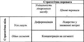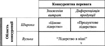 У свою чергу, загальна конкурентна матриця Портера (рис. 5) передбачає три базові стратегії: "цінове лідерство", "продуктове лідерство", "лідерство в ніші".