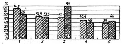 Рис. 9. Критерії переваг кінцевих споживачів та провізорів щодо вибору лікарських препаратів: а — споживачі, б — провізори; 1 — ціна, 2 — відомість, 3 — ефективність, 4 — упаковка, 5 — лікарська форма