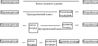 Один из членов канала, как правило, либо является собственником остальных, либо предоставляет им определенные привилегии. Таким членом может быть производитель, оптовый или розничный посредник. Вертикальные каналы возникали как средство контроля за поведением канала. Они экономичны и исключают дублирование членами канала исполняемых функций. При формировании канала распределения товара на первое место выдвигается решение о структуре канала, т.е. о количестве уровней канала и о конкретном составе членов канала. При выявлении возможных вариантов каналов распределения необходимо определиться с типом используемых посредников.