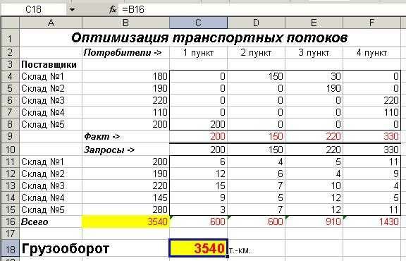 В строке 16 по столбцам C-F определим грузооборот по каждому пункту доставки. К примеру для 1 пункта (ячейка С16) это рассчитывается с помощью формулы
