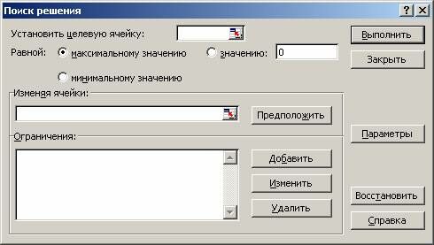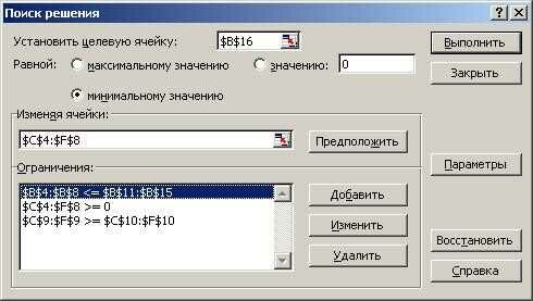 Если сейчас запустить процесс подбора параметров, то будет найден вариант, где все переменные равны нулю. И это правильно - если не перевозить ничего, то это самый дешевый вариант. Но нам необходимо перевезти минеральные удобрения, поэтому надо наложить некоторые ограничения для поиска решения.