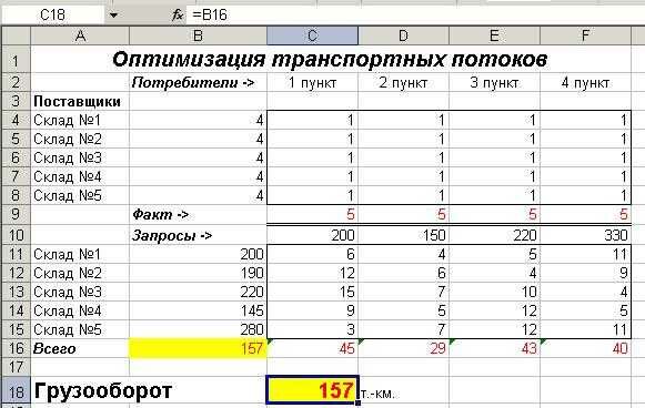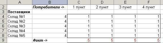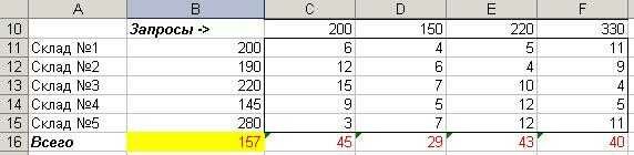 В ячейках с В4 по В8 на листе находятся объемы поставок с конкретных складов. В ячейках с В11 по В15 - запасы на этих же складах. Так как невозможно вывести со склада больше, чем на нем есть, первое значение должно быть не больше второго.