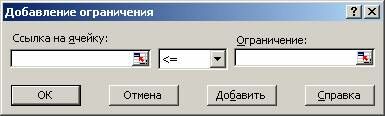 Следует ввести левую часть ограничения в левое поле, выбрать знак условия, накладываемого на значение и ввести правую часть ограничения. Как и в других случаях, можно не вводить ссылки на ячейки, а выделить мышью эти ячейки. После ввода одного ограничения следует нажать кнопку Добавить и ввести следующее. По окончании ввода всех ограничений нажмите на кнопку ОК. В диалоге появятся строки введенных ограничений (рис. 10)
