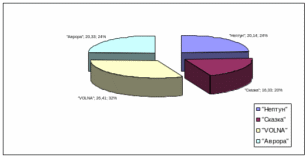 Из диаграммы видно, что фирма ООО "VOLNA", имеет максимальную "силу бизнеса" среди трех конкурентов, которая составляет 26,41, контролирует самую высокую долю рынка 32%, а конкурент "Сказка" имеющей минимальную "силу бизнеса", составляющую 16,33, занимает самую низкую долю рынка, которая равна 20%.
