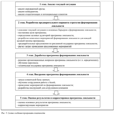 Рассмотрим процесс создания лояльности с помощью схемы, приведенной на рис. 1, а также основные этапы внедрения программы лояльности.
