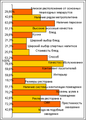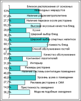является третьим, по значимости, фактором. Его отметили 70,2% экспертов. Следует отметить еще три фактора, оказывающих влияние на выбор ресторана для деловой встречи. Это (мнение 63,8% экспертов), (59,6%) и (также 59,6%). Эти факторы не являются типовыми, но значение их достаточно велико. На первом месте среди факторов, которыми можно пренебречь при выборе ресторана для деловой встречи, находится (только 19,1% экспертов отнесли этот фактор к значимым). Второе место делят между собой (по 21,3% соответственно). Третье место занимает (25,5% экспертов).