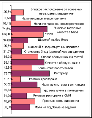 | 1.Очень низкое качество обслуживания (87,2%) 2.Плохие вкусовые качества блюд в ресторане (85,1%) 3.Высокие цены на блюда (78,7%) 4.В помещении очень душно и накурено (72,3%) 5.Музыка в помещении играет очень громко (51,1%) | 1.Об этом ресторане не упоминается в СМИ (2,1%) 2.Это заведение не посещают критики, публичные персоны и светские (4,3%) 3.Заведение не престижное (6,4%) |