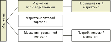 Несколько иной взгляд на классификацию маркетинга на промышленный и потребительский представлен на рисунке 24. Главный критерий деления здесь - наличие производства, то есть процесса создания товара от его замысла и проектирования до изготовления.