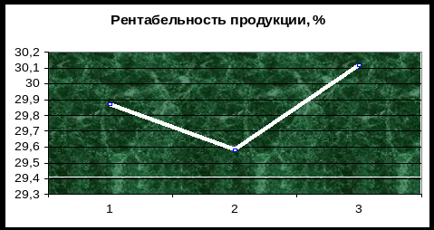 Динамика рентабельности продукции колеблется в пределах 30%. Темп роста рентабельности за анализируемый период составил 1%.