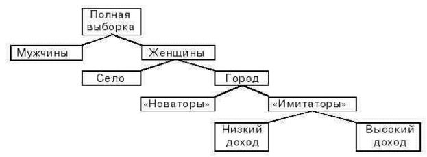 Метод группировок состоит в последовательной разбивке совокупности объектов на группы по наиболее значимым признакам. Какой-либо признак выделяется в качестве системообразующего критерия (владелец товара, потребитель, намеревающийся приобрести товар), затем формируются подгруппы, в которых значимость этого критерия значительно выше, чем по всей совокупности потенциальных потребителей данного товара. Путем последовательных разбивок на две части выборка делится на ряд подгрупп.