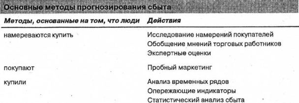 Для прогнозирования своего сбыта компании используют ряд специальных методов. В таблице перечислены некоторые из них. Все прогнозы строятся на основе анализа информации о том, что люди намереваются купить, что покупают, что купили. Первое — что люди намереваются купить — включает в себя исследования мнений покупателей и людей, которые имеют дело с покупателями, например продавцов и независимых экспертов. На этом этапе применяется три метода: исследование намерений покупателей, обобщение мнений торговых работников и изучение мнений экспертов. Построение прогноза на основе того, что люди покупают, предполагает размещение товара на пробном рынке для определения реакции покупателей. Последний этап — что люди купили — предполагает анализ отчетов о покупательском поведении в прошлом либо анализ временных рядов или статистический анализ сбыта рис. 6.
