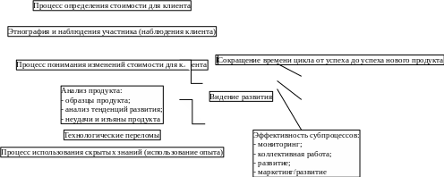 а рисунке 2. представлен процесс, спроектированный для генерации целостной информации о клиенте с целью сокращения этапов создания нового продукта. В нем учтенная схема исследования будущих ожиданий клиентов, этнографические процессы и процессы понимания изменений ценности для клиентов, обогащенные анализами продуктов, исследование технологических переломов, креативности и видение развития.