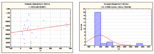 | Regression Summary for Dependent Variable: Y (Spreadsheet1) R= 64046797 R?= ,41019922 Adjusted R?= ,38339009 F(1,22)=15,301 p<,00075 Std.Error of estimate: 16217, | ||||||