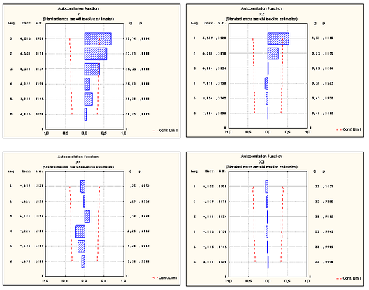 На первом этапе своего исследования, я проверила гипотезу относительно однородности данных, независимости наблюдений, нормальности распределения данных. В итоге пришла к выводу, что данные по факторам У и Х2 однородны, распределены приблизительно нормально. На это указывает отсутствие скопления точек вдоль линии тенденции на диаграммах "рассеивания" и то, что линия средней не параллельна, гистограммы плотности распределения и функции распределения на нормальной вероятностной бумаге свидетельствуют о близости распределения данных к нормальному. ( см. Рис 1-3 стр.21). Тогда как факторы Х1 Х3 довольно не однородны и их распределение не однородно. Что так же видно из гистограммы и диаграммы "рассеивания". Учитывая то, что мною проводится анализ временных рядов, данный факт не противоречит исследованию.