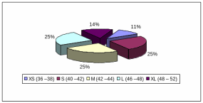 Из данных таблицы 2.8 видно, что максимальную долю в объеме предложения женских колготок занимают модели среднего размера: М (middle) – средний (42 – 44) – 1715 пар (25,3%), S (small) – маленький (40 – 42) – 1710 пар (25,22%) и L (1arge) – большой (46 – 48) – 1680 пар (24,78%). Такая структура предложения ассортимента достаточно обоснована, так как большинство потребителей укладываются в эти рамки.
