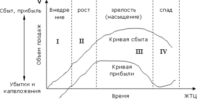 Жизненный цикл товара (ЖЦТ) – это время с момента его первоначального появления на рынке до прекращения его реализации. Каждый конкретный, индивидуальный образец товара появляется, существует, удовлетворяя какие-либо потребности, и, исчерпав свои возможности, исчезает, прекращает свое существование. В течение жизненного цикла товара объемы его реализации (а значит, и прибыль) различны, что отражено на рисунке 2.
