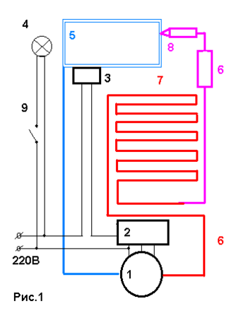 Мотор - компрессор (1), засасывает газообразный фреон из испарителя, сжимает его, и через фильтр (6) выталкивает в конденсатор (7).