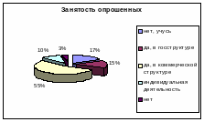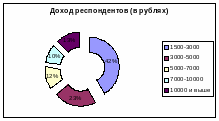 Несмотря на возраст (39% опрошенных указали, что им еще нет 24-х лет), только 3% нигде не работают, а 17% респондентов не работают, поскольку учатся. 55% опрошенных работают в коммерческих структурах. Большинство опрошенных респондентов отметило невысокий доход — 42% зарабатывают от 1500 до 3000 рублей, 23% — от 3000 до 5000 рублей. Однако уровень дохода респондентов ни коим образом не зависит от их возраста. Он зависит во многом от организации, в которой они работают. Причем нельзя сказать, что в коммерческой структуре платят много, а в других — мало. Те, кто работают в коммерческой структуре, указали самый большой разброс доходов, то есть примерно равное количество тех, кто получает 1500—3000 рублей, 3000-5000, 5000-7000 и больше 1000 рублей. Выявились и такие закономерности: в государственной структуре, как правило, доход не превышает 3000 рублей, а при индивидуальной деятельности он превышает 10000 рублей.