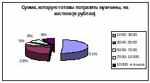 Но распределение суммы, которую готовы потратить мужчины на костюм, оказалось несколько иным, чем доход мужчин. Анализируя анкеты, можно заметить, что иногда мужчины, которые получают больше 10000 рублей, покупают себе костюм за 1000—3000 рублей, а те, кто получает 3000-5000 рублей в месяц, готовы потратить на приобретение костюма больше 10000 рублей.