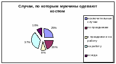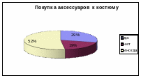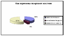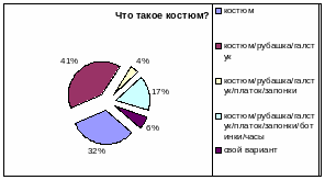 Особый интерес представляет вопрос анкеты «Что мужчины включают в понятие «костюм». При проведении опроса выяснилось следующее: 41% мужчин считают, что в понятие «костюм» входят брюки, пиджак, рубашка и галстук, немного меньше — 32% — говоря о костюме, подразумевают только пиджак и брюки. Кроме того, мужчины покупают аксессуары к костюмам.