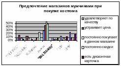 1.Молодые люди в возрасте до 24-х лет (как работающие, так и неработающие) предпочитают осуществлять покупки в таких магазинах, как ЦУМ, ГУМ (более 75% опрошенных); «BALTMANN», «ПЕПЛОС» (около 50% опрошенных). Все опрошенные молодые люди также отмечали магазины и торговые комплексы, которые находятся в районах их непосредственного проживания.