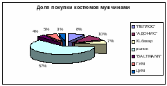 2. Молодые люди в возрасте от 25-ти до 34-х лет с доходами ниже 3000 рублей при покупке костюмов отдают предпочтение магазину-салону швейного объединения «АДОНИС» (10% опрошенных); рыночным комплексам (более 60% опрошенных), при этом рынки выбираются в зависимости от их близости к месту жительства, работы. Молодые люди этой же возрастной группы, но имеющие более высокие доходы, предпочитают магазины: ЦУМ — 3% опрошенных, ГУМ — 5%, XL— 7%.