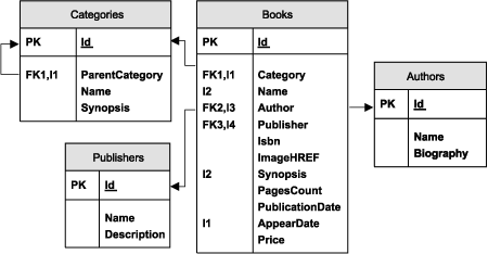 Как уже упоминалось выше, описать параметры книги можно в одной таблице, но можно вынести описание в несколько отдельных таблиц, это позволит повысить информативность Интернет-каталога и сведений о товарах, которые в нем представлены, а также упростит возможные изменения структуры базы данных в будущем. Таким образом, в нашем примере книги будут описаны тремя логически связанными таблицами: