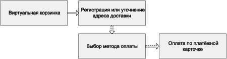 Виртуальная покупательская корзинка содержит товары, добавленные покупателем, позволяет произвести пересчет или удаление товаров и перейти к окончательным фазам Интернет-продажи. На этом этапе производится регистрация покупателя и уточнение адреса доставки. В данном проекте применяется упрощенная схема корзинки. Полная схема покупательской корзинки включает в себя возможность заказа товаров одним покупателем на различные адреса и хранение истории предыдущих покупок и адресов, по которым они были доставлены, виртуальный кошелек, набор скидок и другие интересные виды сервиса Интернет-торговли. Упрощенная схема позволяет покупателю заказывать товары и выбирать адрес доставк. После подключения Интернет-магазина к одной из платежных систем покупатель сможет выбирать наиболее удобную для него систему оплаты и оплачивать товар с помощью платежных карт, не отходя от компьютера.