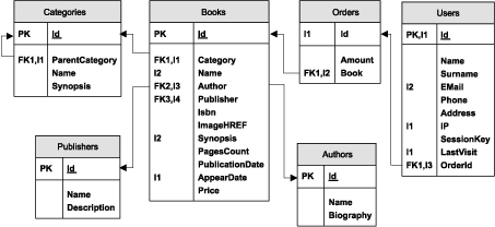 В каталоге книг Интернет-магазина, описанном выше, можно выделить семь составляющих: