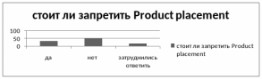 7.На вопрос , рациональным ли будет полностью запретить Product placement в телепродукции половина опрошенных ответили нет, так как он помогает ориентироваться на рынке товаров и услуг, 33% (10 человек) считают, что это бесполезная трата эфирного времени, 17% (5 человек) затруднились ответить на данный вопрос.