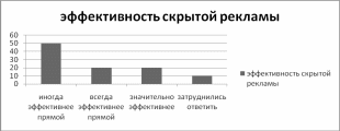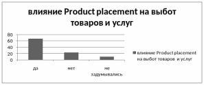 Вывод: несмотря на то, что многие опрошенные отрицательно относятся к рекламе на телевидении(23%), многие уверены в том, что скрытая реклама оказывает влияние на предпочтения потребителей(60%), а также внедрение в сюжетную линию фильма или шоу рекламы помогает ориентироваться при выборе товаров и услуг. Также большинство считает, что реклама, размещенная в художественном фильме эффективнее рекламных роликов при условии более запоминающейся и профессионально внедренной в сюжетную линию фильма рекламы. Большинство из тех, кто убежден, в том, что Product placement эффективный способ воздействия на потребительский выбор согласны с тем, что данный вид рекламы позволяет повысить узнаваемость товара.