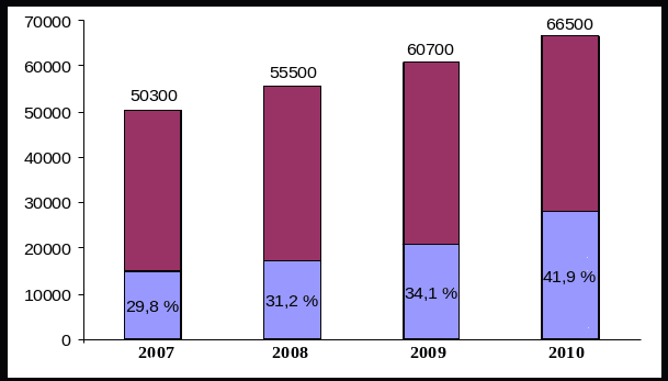 Рис. 3.1. Удельный вес энергонасыщенных тракторов в общем объёме экспорта тракторов в 2007-2010 гг.
