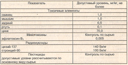 Показатели безопасности должны соответствовать по уровню содержания токсичных элементов, микотоксинов, радионуклидов и пестицидов, а также по микробиологическим показателям нормам МБТ (таблицы 3 и 4).