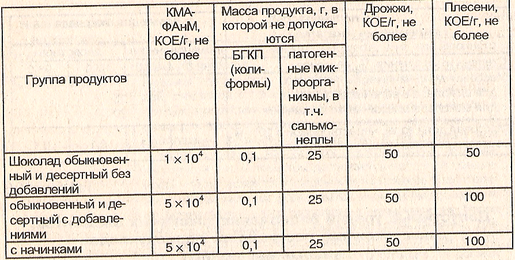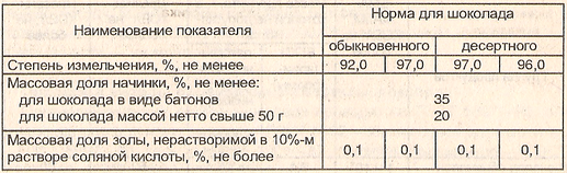 В шоколаде нормируются содержание начинки, массовая доля золы, нерастворимой в 10%-м растворе соляной кислоты, степень измельчения. Массовые доли сахара, жира и влаги должны соответствовать расчётным содержанием по рецептуре с учётом допустимых отклонений, массовая доля какао-продуктов – не менее 25%.