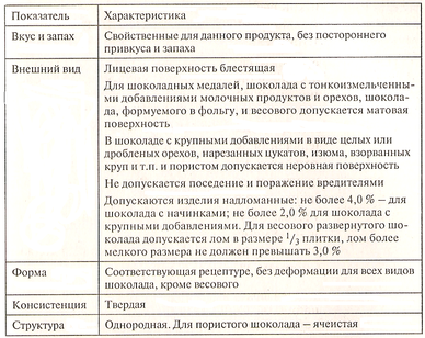 Внешний вид определяется состоянием лицевой и нижней поверхностей шоколада. Лицевая поверхность шоколада без добавлений должна быть блестящей, без сероватого налета и пятен, с добавлениями – может быть слегка тусклой. Не допускается выход начинки на поверхность шоколада. Консистенция при температуре 180С твердая. Структура шоколада без добавок и с тонкоизмельченными добавками – однородная, пористо-ячеистая. Крупноизмельченные добавки (вафли, орехи, печенье) должны распределяться в массе равномерно. Форма плиток и фигур шоколада должна быть правильной, без деформаций. Вкус и аромат определяют опробованием. Они должны быть ясно выраженными с тонким шоколадным или ванильным ароматом, ароматом от добавок и приятной горечью. Шоколад с добавлениями должен иметь гармоничный вкус.