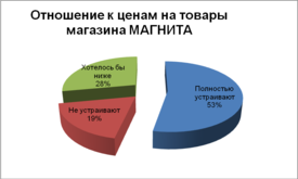Это подтверждает столь высокий процент опрашиваемых, которых полностью устраивают цены в магазине - 53%. Как известно в сложившейся экономической ситуации, магазин "Магнит" не значительно поднял цены на товары, но тем не менее 28% опрашиваемых желают, что бы цены были ниже на определенные группы товаров: молочные продукты, многие жалуются на постоянное колебание цен. Но всё равно эти продукты остаются востребованными, так как они необходимы каждому человеку. Но не обошлось без тех, кого цены на товары не устраивают-19%, в основном это пенсионеры и люди с маленьким заработком.