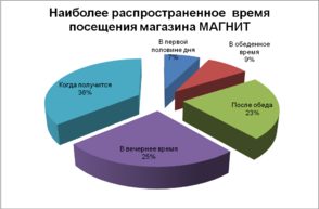 36% опрашиваемых затруднились назвать время посещения и отвечали - когда получиться, 25% - отвечали в вечернее время, так как это наиболее удобно для рабочего населения.23% опрашиваемых ответили - после обеда, в основном это люди преклонного возраста. Многие жаловались на позднее открытии магазина "Магнит", особенно в Трусовском районе, а так же Жилгородке, поэтому количество посещаемых в первой половине дня составило 7% опрашиваемых.